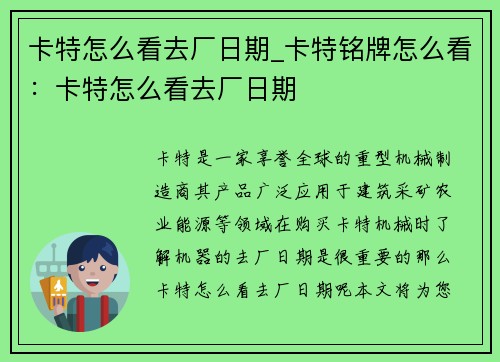 卡特怎么看去厂日期是购买卡特机械时需要了解的重要信息。购买者可以通过卡特铭牌上的制造日期、机器的外观和磨损程度、机器的使用情况和维护记录等方面来判断机器的去厂日期。了解机器的去厂日期对于购买者来说非常重要,可以帮助他们更好地了解机器的使用寿命和性能,从而更好地维护和保养机器。